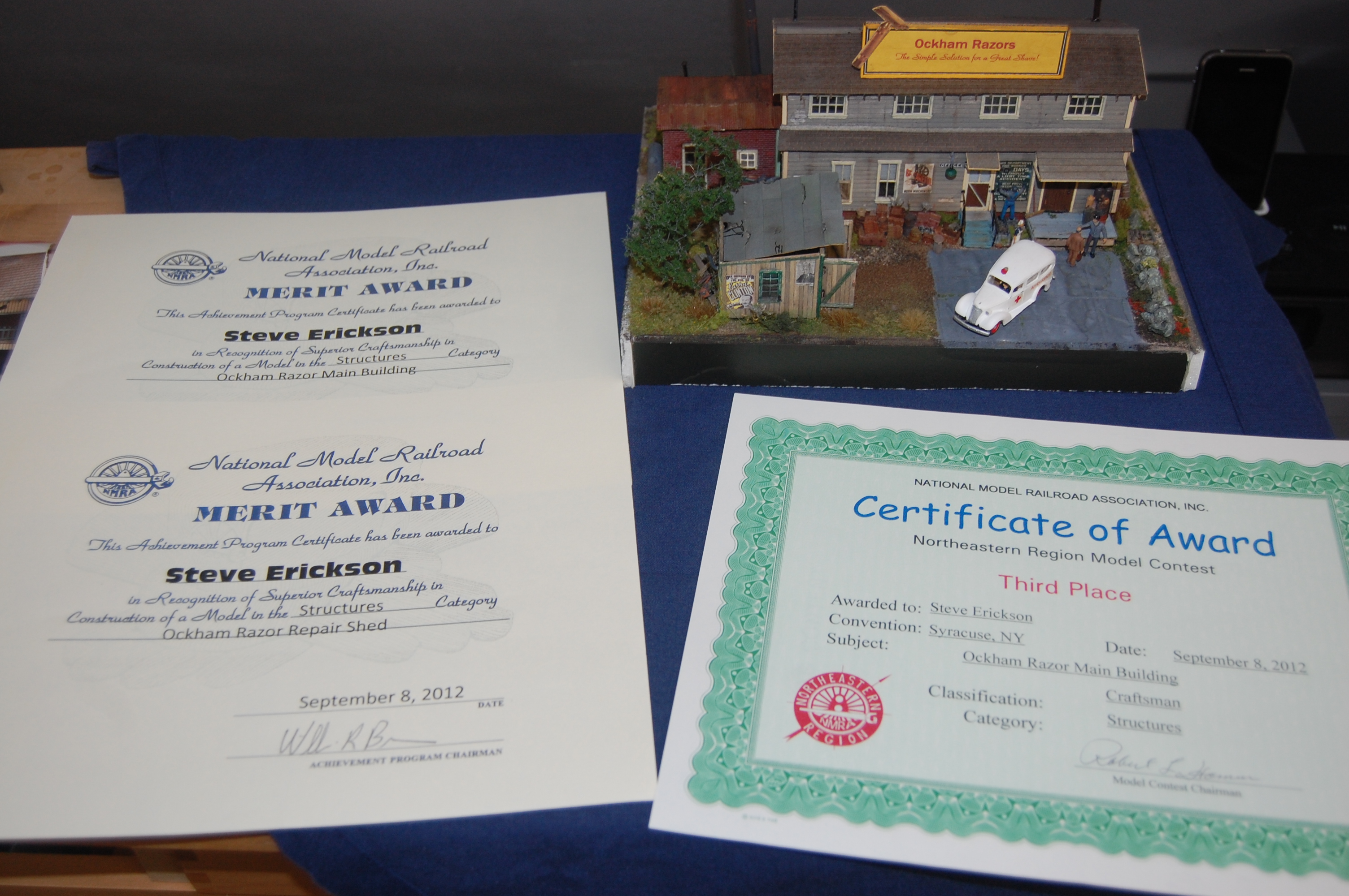 I submitted Ockham’s razor in the contests at the convention, and did well. Each of the individual buildings received a merit award, which puts the one third of the way toward finishing the structures I need for the structure certificate under the master model railroader program.
