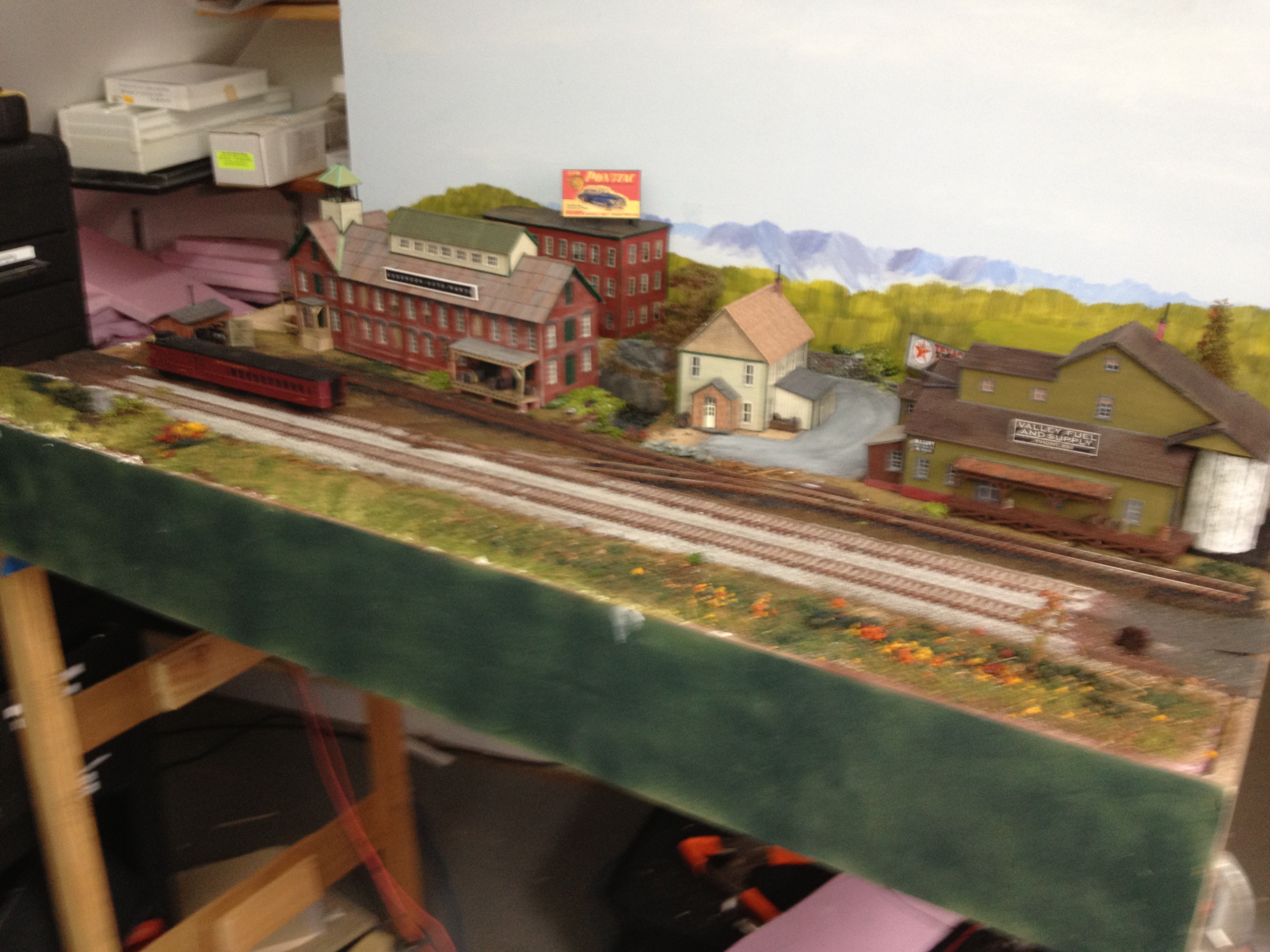 The brick building in front is kit bashed from an RDM kit. The building behind it is scratch built, as is the company office. There is a small Woodland Scenics metal blacksmith shop kit in front of the mill. The billboards are all scratch built and period authentic The other structure is from Branchline, which I am in the process of upgrading.