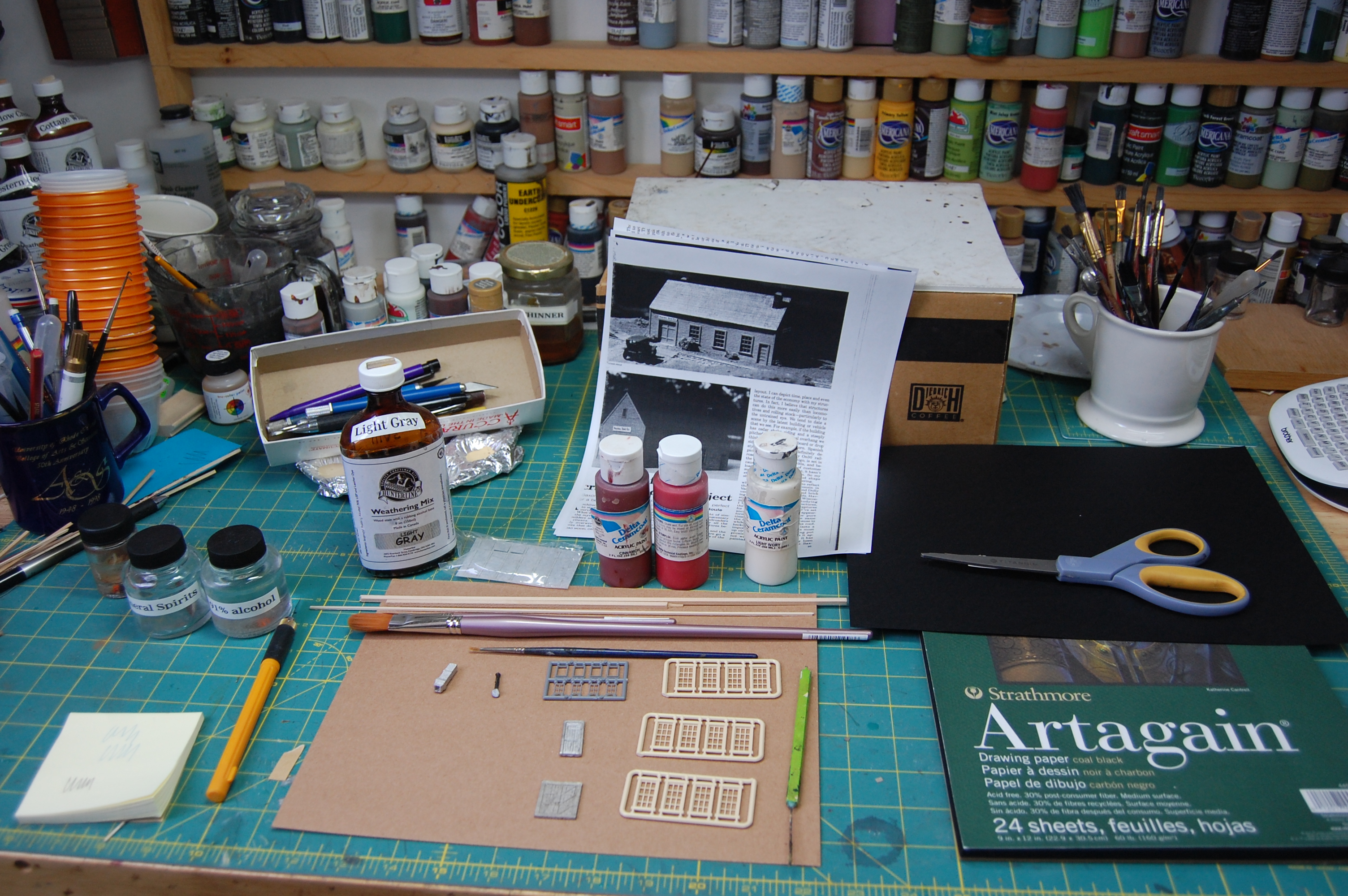 This photo shows the basic materials assembled: acrylic paints, some card stock (chip board, with a smooth side and a rough side), black Artagain pastel paper, a plan, and the usual hobby tools.